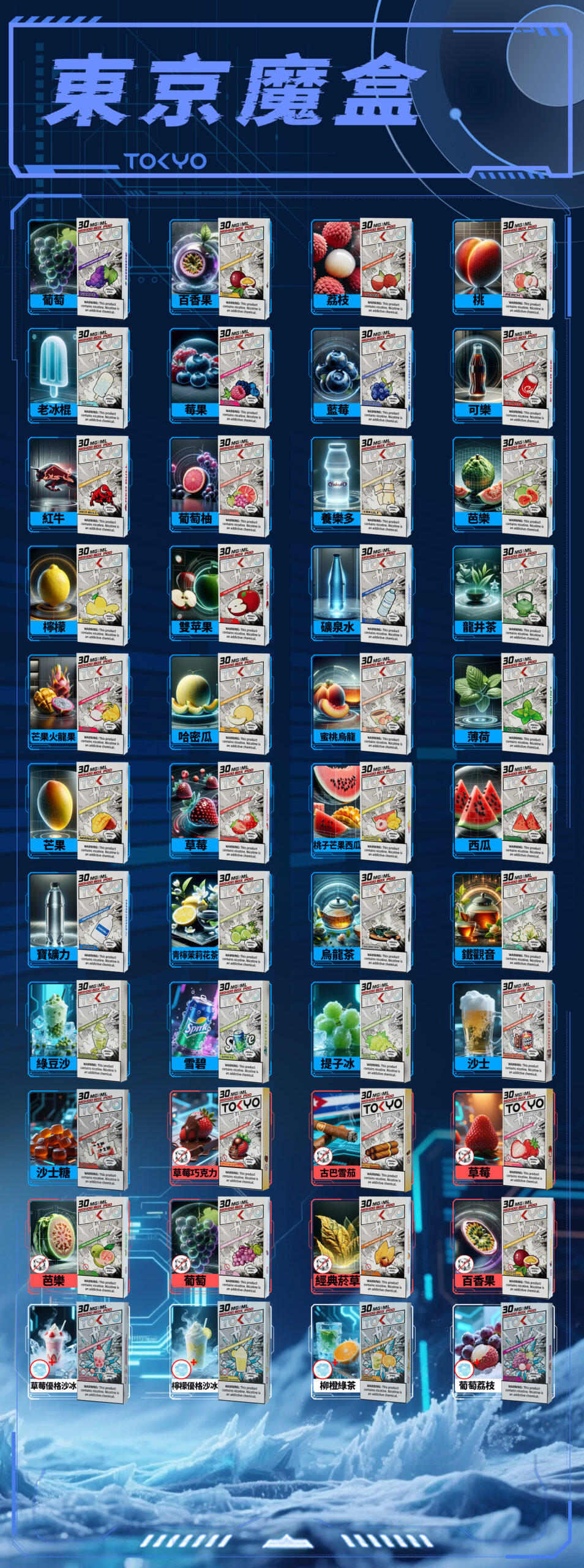 | 魔盒口味選擇 | 冰棍, 可樂, 哈密瓜, 寶礦, 檸檬, 檸檬茉莉, 烏龍, 百香果, 百香無涼, 礦泉, 紅牛, 經典煙草, 綜合, 芒果, 芒果火龍果, 芭樂, 芭樂無涼, 草莓, 荔枝, 莓果, 葡萄, 葡萄無涼, 薄荷, 藍莓, 蘋果, 蜜桃, 蜜桃烏龍, 西柚葡萄, 西瓜, 鐵觀音, 養樂多, 龍井, 草莓優格冰沙, 檸檬優格冰沙, 柳橙綠茶, 貴妃葡萄, 麥根沙士, 白葡萄, 古巴雪茄 |